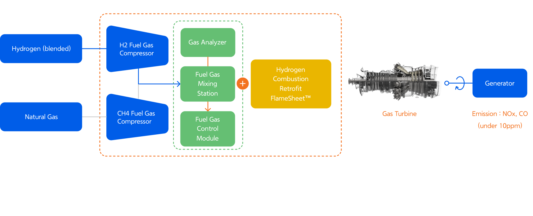 또한 주요 OEM사 가스터빈에 적용할 수 있어 기존 발전 설비를 최소한의 개조로 빠르게 수소 발전으로 전환할 수 있습니다.