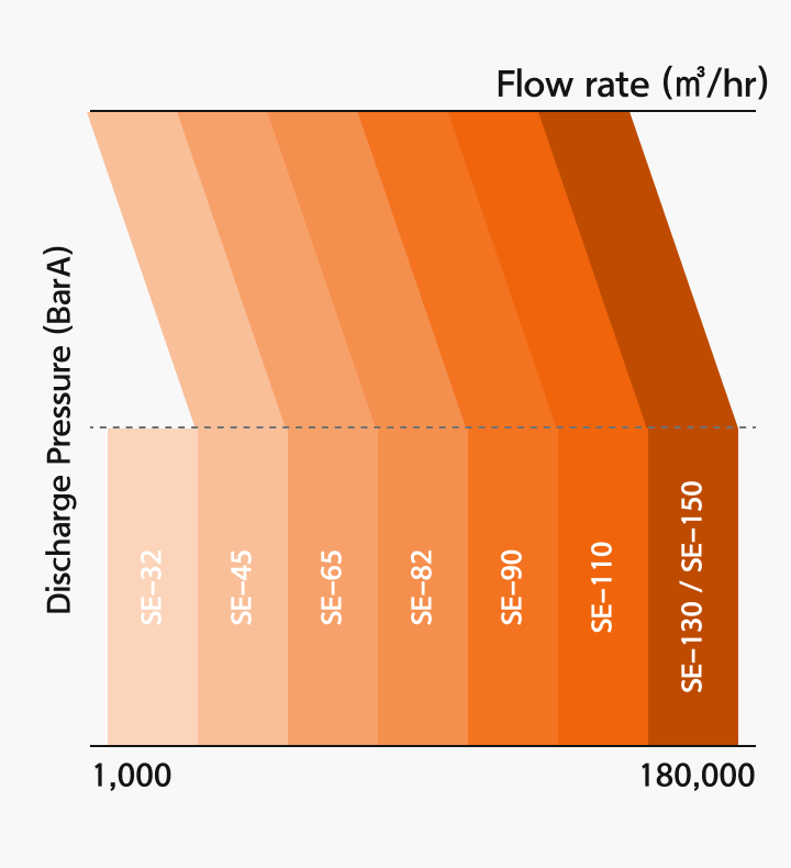 우리 압축기는 최대 180,000 ㎥/hr의 유량까지 대응할 수 있는 폭넓은 제품 라인업을 갖추고 있어, 고객의 다양한 유량 요구에 맞춰 유연하게 대응합니다.